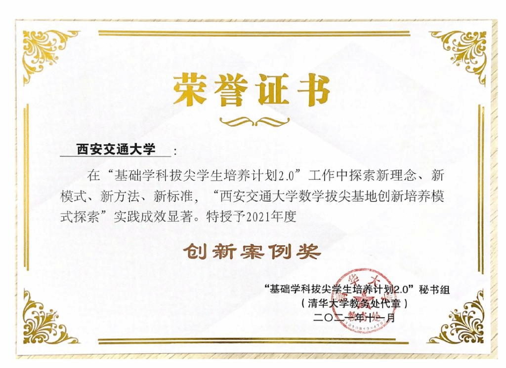 近日,教育部公布了2021年度基础学科拔尖学生培养计划2.0荣誉奖项名单,以我院数学拔尖人才培养的特色做法为内容的案例“西安交通大学数学拔尖基地创新培养模式探索”荣获创新案例奖;我院易媛教授荣获优秀教师奖;我院2015级数学试验班谢鹏程同学荣获优秀学生奖。