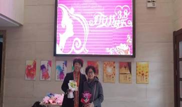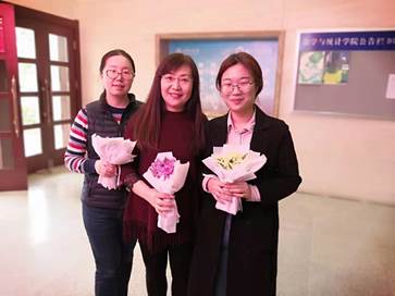 在数学楼门口,鲜花和礼物整齐得摆放在桌上,“致美丽的您”海报也张贴在学院门口。学生代表们站在门口,给每一位女老师们送上一束美丽的鲜花,以表达对老师们的感恩和祝福。